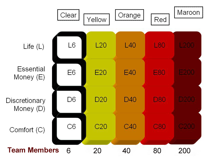 The color spectrum is used to decide on the variant for a project, factors such as; Comfort, Discretionary Money, Essential Money and Life, play vital role in determining the type or vigor (or in Crystal terminology, the “weight”) of the methodology, which is represented in various colors along a select spectrum